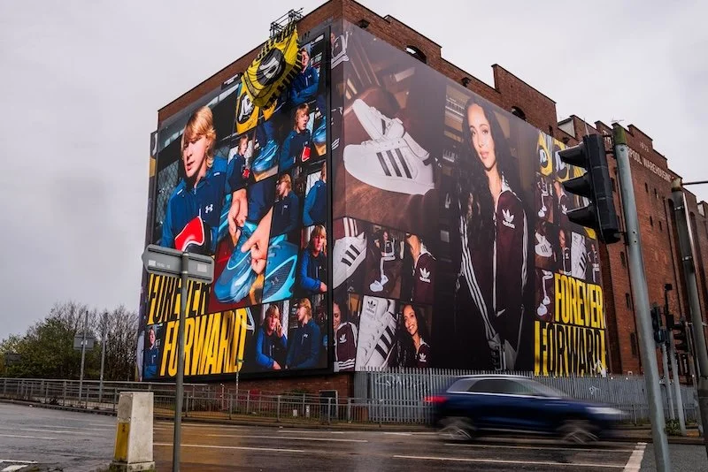 JD Sports has become the first brand to activate on the newly enhanced Manchester Screen, setting a strong benchmark for the scale and creativity the site can support. The campaign delivered a full takeover across the entire 1,140 m² combined canvas, using both the digital screen and the expansive static wrap for maximum visibility.