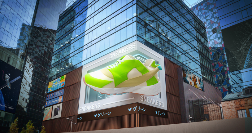 A well-known example is Maybelline’s London Underground 3D mascara ad, which appeared to have a real tube train brushing through giant mascara bristles. It became one of the most talked-about outdoor campaigns of 2023. Another standout was Nike’s Air Max Day display, where the shoe appeared to float mid-air above the screen. Both used anamorphic perspective mapping to create a moment of disbelief that encouraged filming and sharing on social media.